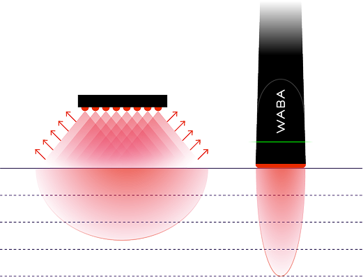 Research indicates that skin can reflect up to 90-95% of red and near-infrared light, with only 10-12% of light irradiance being absorbed in skin models [1,2]. This high reflectance often leads non-contact methods to use potentially harmful high intensities to reach deeper tissues, risking overheating and overdosing surface skin [2]. Our contact method eliminates these inefficiencies by minimizing reflection and maximizing absorption, allowing for precise dosing. This approach aligns with numerous PubMed studies that utilize contact methods with LED clusters, arrays, and lasers to achieve the most accurate dosage and eliminate reflection variability [3].